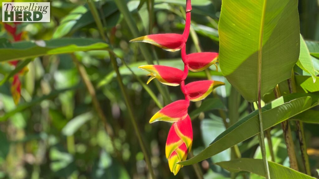 The hanging lobster claw plant heliconia rostrata grows up to 12 feet high and attracts hummingbirds although we didn’t see any.