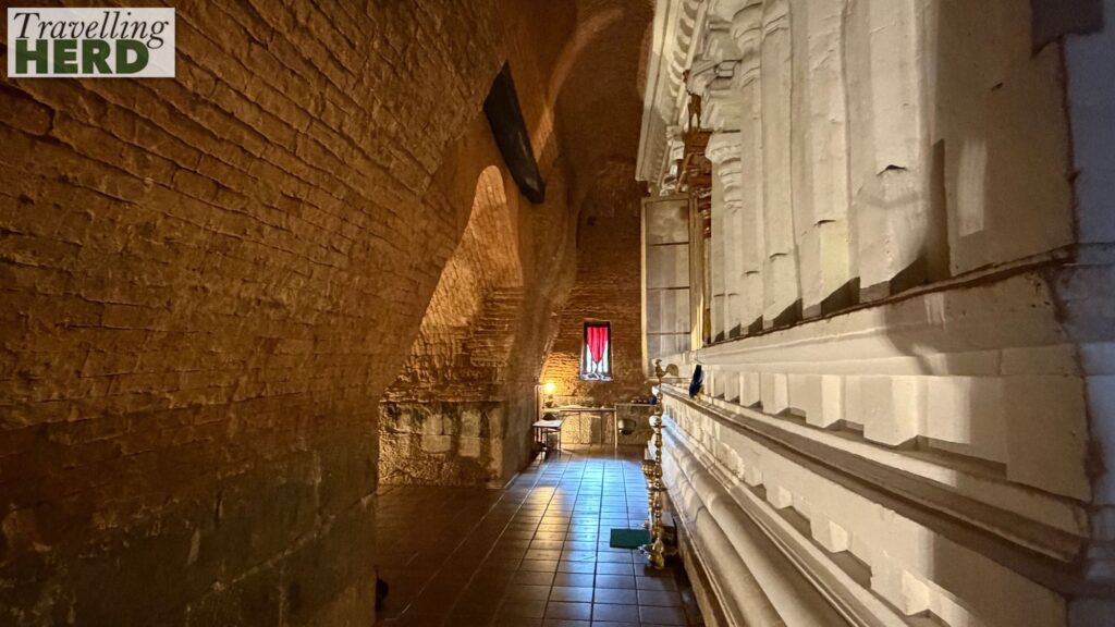 Within the Lankathilaka Temple the white Buddhist temple is surrounded by the brick Hindu temple which has four metre thick walls.