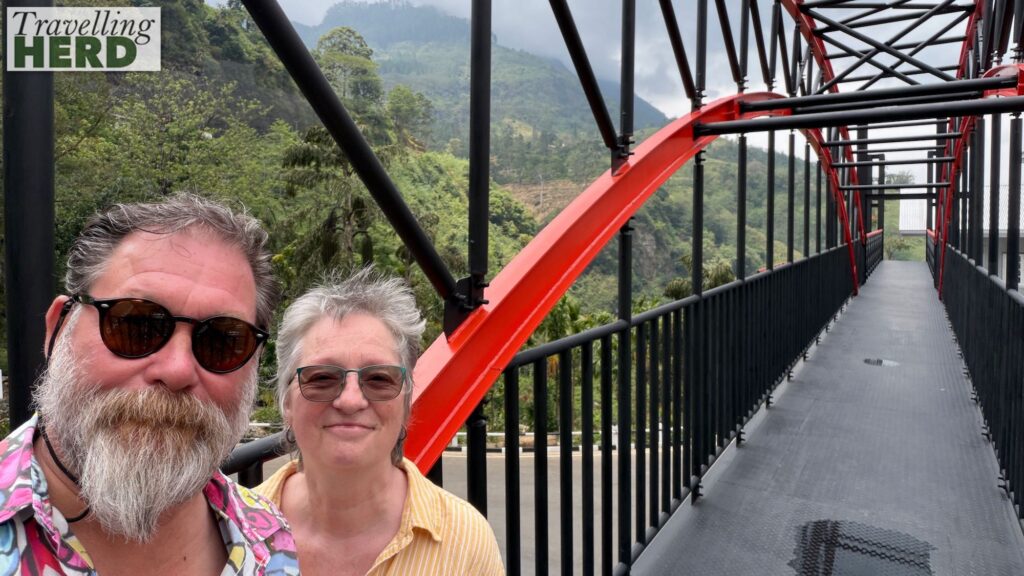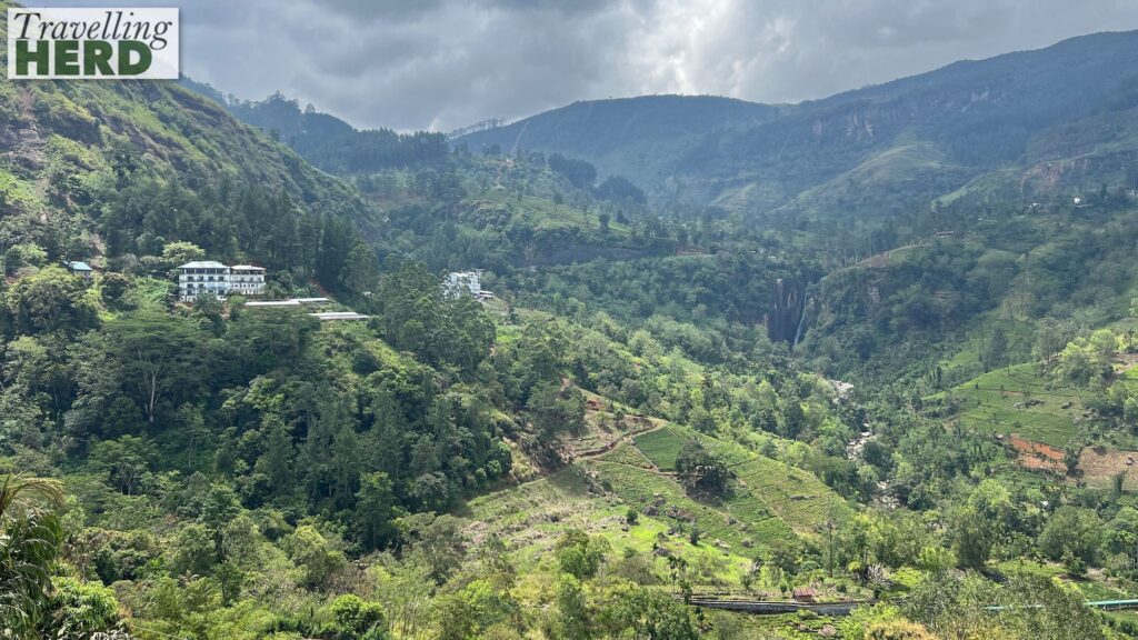 On Saturday we had originally planned that we would get the train from Kandy to Nuwara Eliya which is also known as ‘Little England’. Unfortunately this section is not yet running after the cyclone damage at the end of last year. We therefore made the journey by car and the driver took us to a number of sights on the way. The first was a stop to admire scenery and distant waterfalls which we believe to be the 109 m or 358 ft high Ramboda Falls – made more dramatic because of the impending rain. The driver also stopped a little further on so we could get a better view of a roadside waterfall [see Video of the day].