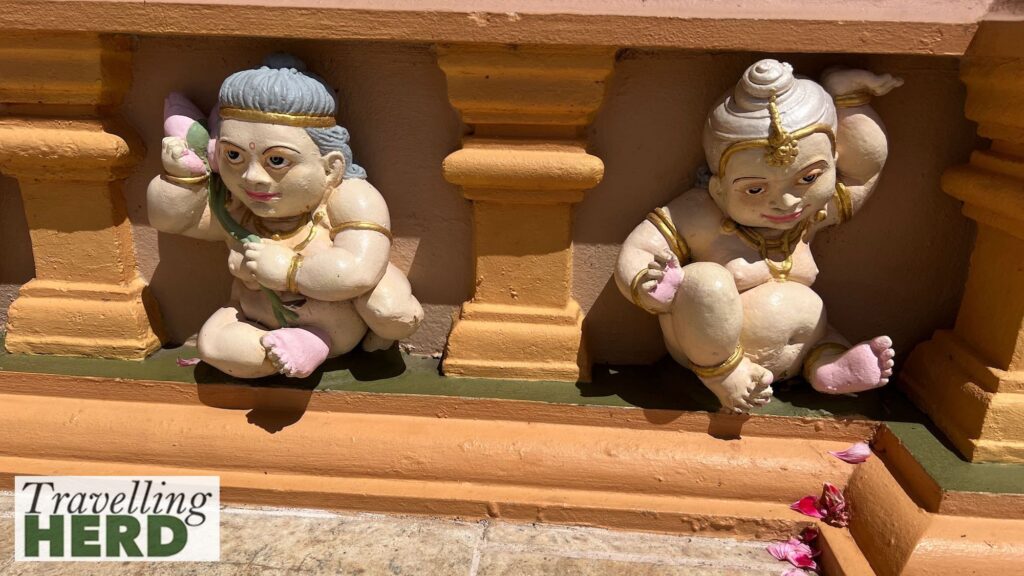 We have noticed that many of the temples we have visited feature cheerful carvings of dwarves. We first noticed them on the guard-stones in Anuradhapura. They symbolise loyal guardians providing protection for sacred relics and treasures as well as prosperity and the bearing of heavy burdens. They are often depicted with big bellies and smiling faces and are frequently seen on the riser on flights of steps up to stupas and temples.