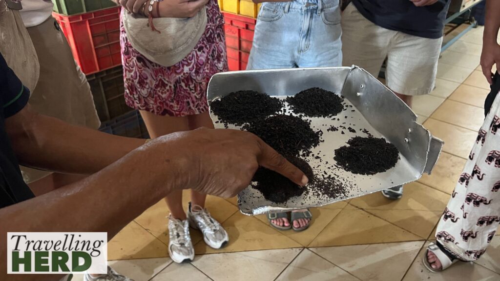 Our guide took samples as we passed through the factory to show us the different types and quality of tea defined by the size and colour of the particles.