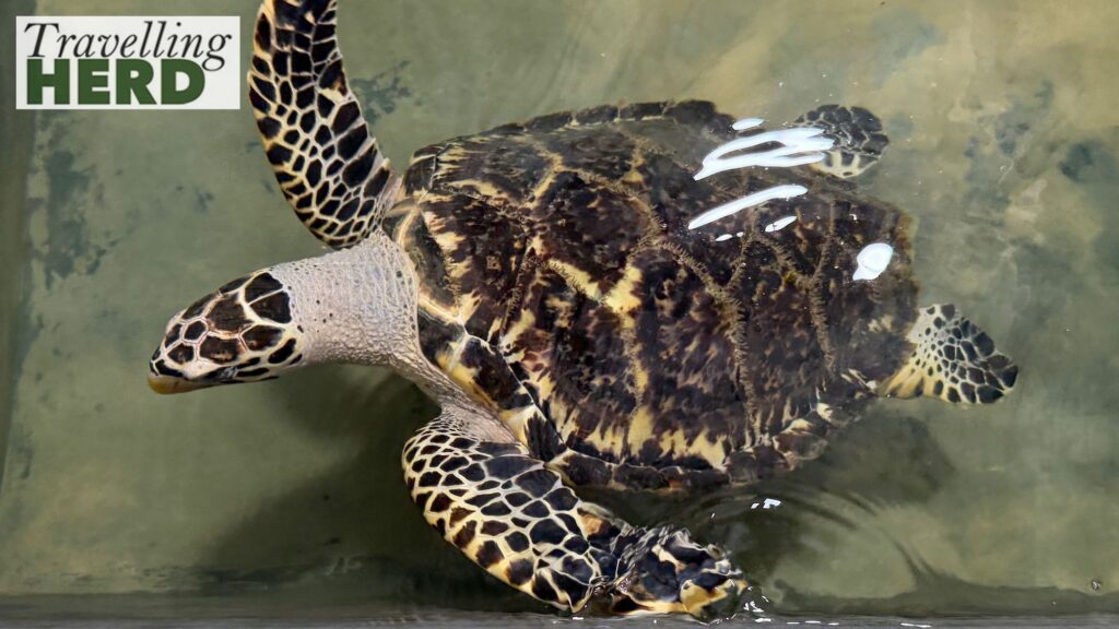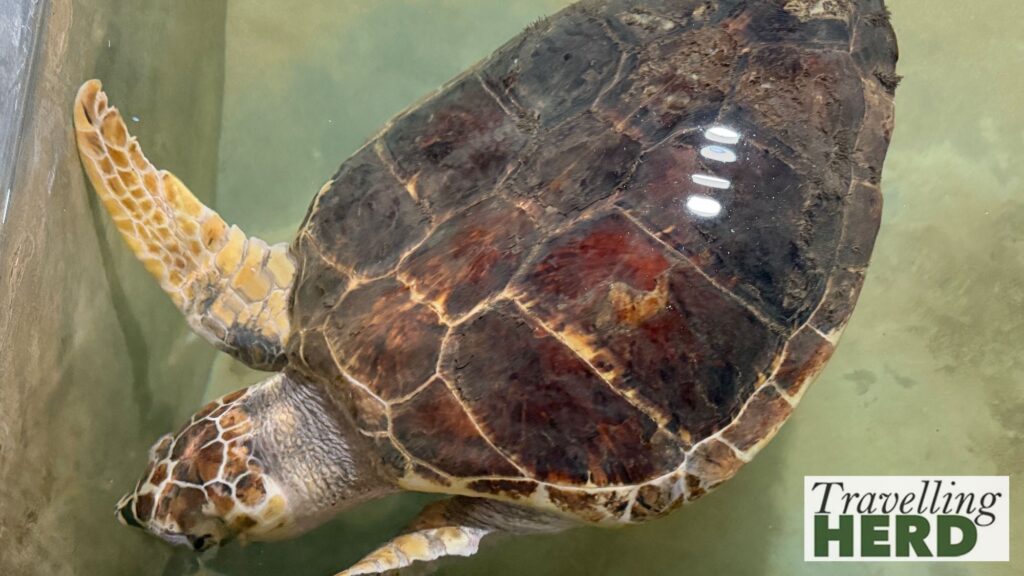 The first tank contained a turtle [see above] that had been found with so many barnacles attached to it that they were depleting the turtle’s calcium levels and weakening its shell. The pale areas are where the shell has become thinner. The barnacles had been safely removed and the turtle was being given calcium therapy, allowing its shell to repair before being released back into the ocean.