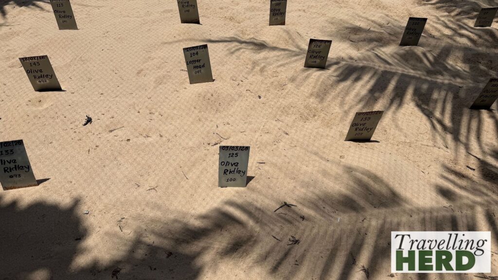 The hatchery is an area close to the beach where eggs have been buried with a sign giving the plot number, the date they were laid, the breed and the number of eggs.
